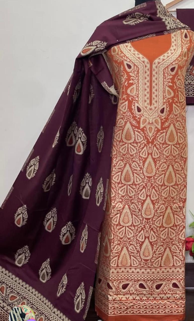 Step into regal charm with Rang-e-Mahal, a suit that embodies the grandeur of royal heritage. The burnt orange kurta, adorned with intricate golden motifs, exudes a warm richness, while the plum-hued dupatta adds depth and sophistication to the ensemble.